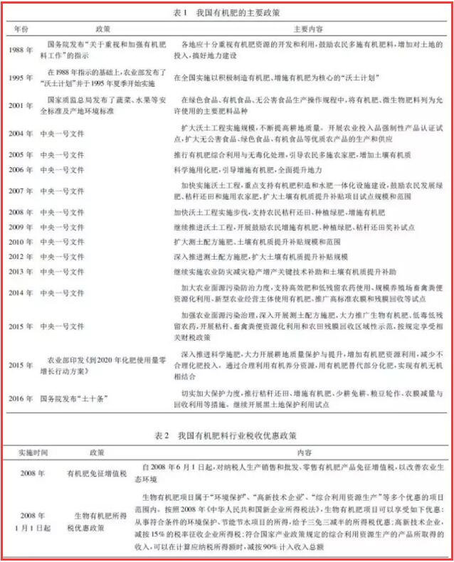 政策可以引導(dǎo)行業(yè)發(fā)展。近年來,中央高度重視有機(jī)肥的施用情況,要求各地大力推廣施用有機(jī)肥。2004—2016 年,連續(xù)13 年發(fā)布以“三農(nóng)”為主題的中央一號文件,強(qiáng)調(diào)了“三農(nóng)”問題在中國社會(huì)主義現(xiàn)代化時(shí)期“重中之重”的地位,有機(jī)肥作為農(nóng)業(yè)生產(chǎn)的重要環(huán)節(jié),除2011 年以外,12 次被納入歷年中央一號文件作為未來產(chǎn)業(yè)發(fā)展的重點(diǎn)。我國有機(jī)肥的主要政策和有機(jī)肥行業(yè)稅收優(yōu)惠政策分別見表 1 和表 2。