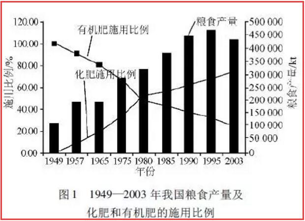我國是農(nóng)業(yè)生產(chǎn)大國,從古至今,有機(jī)肥在我國農(nóng)業(yè)生產(chǎn)中占據(jù)著絕對的主導(dǎo)地位,并隨著我國農(nóng)業(yè)生產(chǎn)的發(fā)展而不斷演變。我國政府十分重視肥料工作,號召廣辟肥源,大力積造有機(jī)肥,發(fā)展化肥生產(chǎn),科學(xué)施用肥料。1949—2003 年我國糧食產(chǎn)量及化肥和有機(jī)肥的施用比例如圖 1 所示。