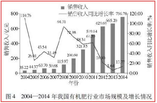 2002 年,我國制訂了有機(jī)肥行業(yè)標(biāo)準(zhǔn)NY525—2002,有機(jī)肥正式進(jìn)入流通領(lǐng)域,行業(yè)進(jìn)入了快速發(fā)展期。經(jīng)過五六年的初步發(fā)展,有機(jī)肥的生產(chǎn)技術(shù)趨于成熟,市場需求量不斷擴(kuò)大,產(chǎn)品豐富多樣,從2008 年開始有了爆發(fā)式的發(fā)展,到2013 年平均銷售額以每年30% 的速度遞增。2004—2014 年我國有機(jī)肥行業(yè)市場規(guī)模及增長情況如圖 4 所示。